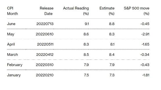 在通脹數據公布之前,這是一個模糊的背景,今年的通脹數據對股市投資者來說一直不太好。標普500指數在每次通脹數據發布后都會下跌,因為月度CPI數據大多比預期的要高。根據彭博社對經濟學家的調查,7月份CPI折合成年率預計將增長8.7%。雖然這一數字低于6月份9.1%的40年高點,但仍遠高于美聯儲2%的通脹目標。
