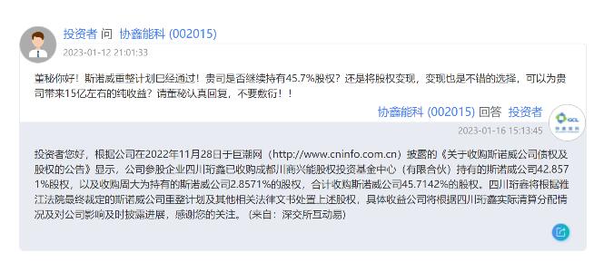 就在1月16日,協(xié)鑫能科在互動(dòng)平臺(tái)回復(fù)稱,公司參股企業(yè)四川珩鑫已收購合計(jì)收購斯諾威公司45.7%的股權(quán)。