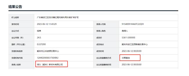 另外,該礦出讓年限24.5年,包括基建期2年。生產規模550萬噸/年,其中,熔劑用石灰巖143萬噸/年、熔劑用白云巖269.5萬噸/年、建筑用石灰巖137.5萬噸/年。保久(韶關)新材料有限公司以5.36億元競得,其屬國資企業。