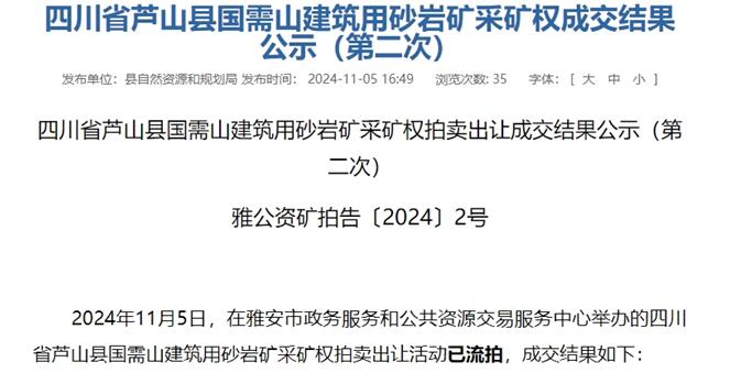 11月5日,四川省雅安市蘆山縣國需山建筑用砂巖礦采礦權第二次掛牌正式流拍。該礦較第一次掛牌降價了200萬元,資源儲量4990.9萬方(折算約1.35億噸),生產規模不低于350萬方/年(折算945萬噸/年),出讓年限15年,起始價超1.3億元,資源成本約2.6元/方。