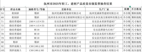 日前,江西省撫州市市場監督管理局發布《撫州市2025年輕工建材等產品質量市級監督抽查結果》。
