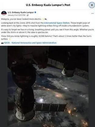 當地時間1月9日,美國駐馬來西亞大使館在社交平臺臉書發布一則帖文,并配發了一張2016年在國際空間站拍攝的照片,顯示雷電在馬來西亞上空的云層中閃現。帖文寫道:“馬來西亞,你從未如此充滿活力。那些明亮的白色光點不是城市燈光——它們是雷暴系統中爆發的巨大閃電。直到你從這個角度看到它,才會意識到我們生活在一個充滿生機的星球上。無論你是在風暴之下還是之上,景色都非常壯觀。”