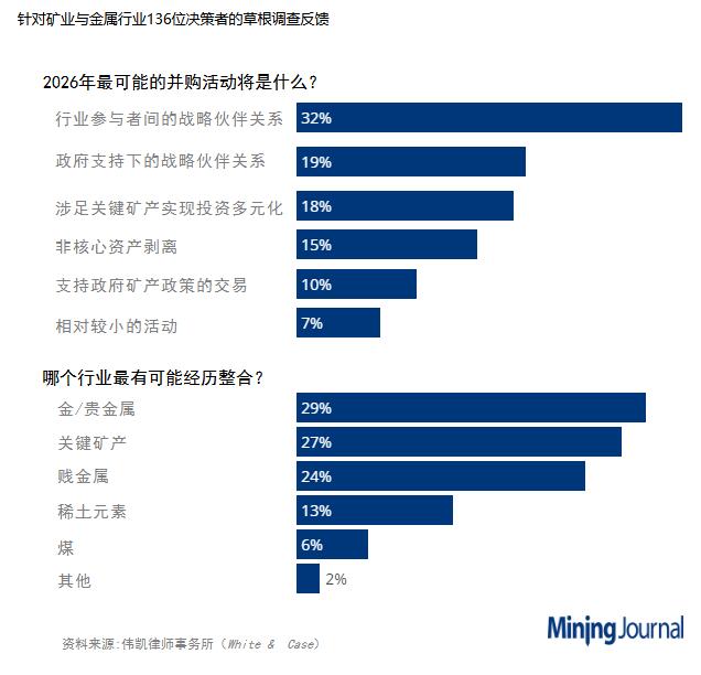 與此同時,調查受訪者預計,黃金和貴金屬將是明年最有可能進行整合的行業,其次是關鍵礦產。