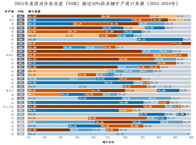 相比之下,2024年的數據顯示,15種礦產品對外依存度達100%,46種礦產品超過50%,USGS稱。